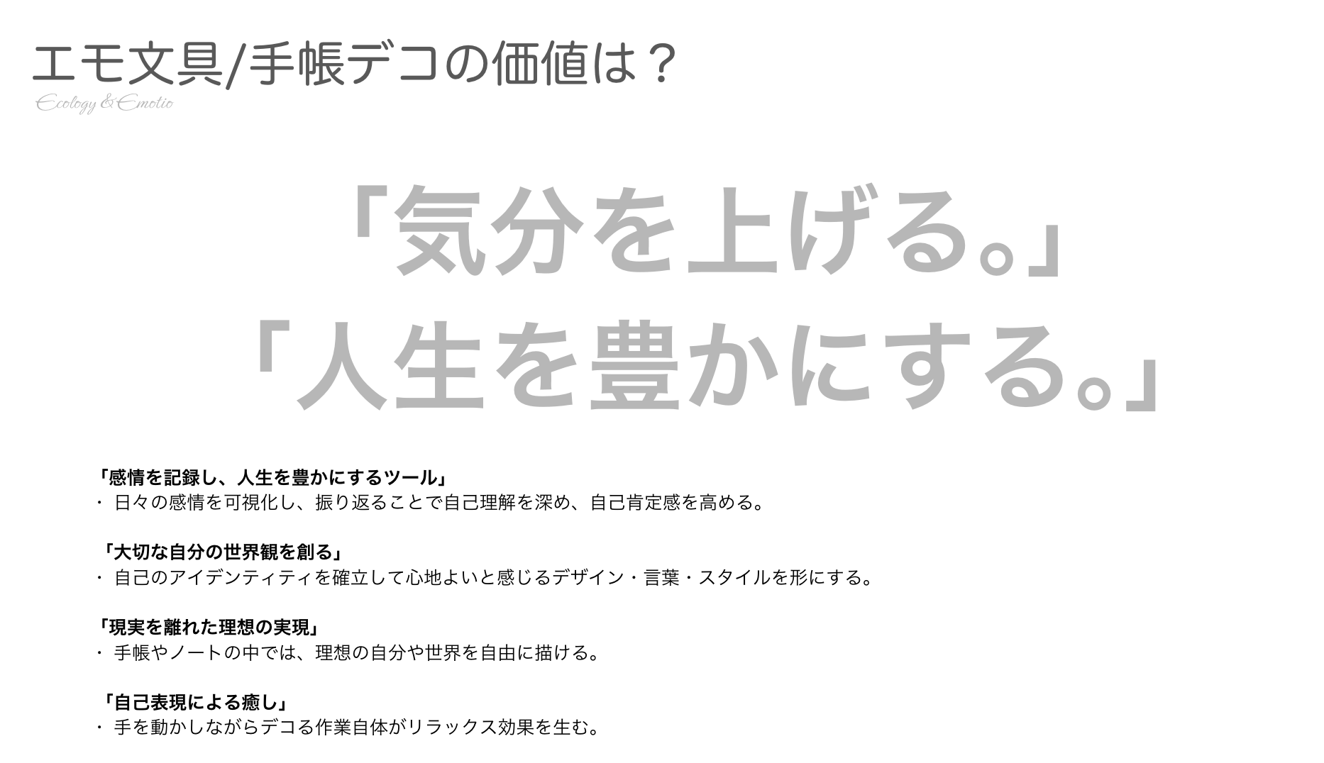 エモい文具や、手帳デコなどで人気のデコ文具については、さくっと説明しますと、手帳はタスクや進捗、スケジュールの管理をするものではありません。メモも、ただ要件を伝えるためのものではなく、ボールペンもあえて滲むことがよいとされるような世界です。機能性がガチで求められる文具ではなく、それを使うことが自己表現の手段となるようなものなんです。デコ手帳では、日記のなかにデコ、飾り付けるという要素を加えることでドールハウスや箱庭、スケッチのような充実・充足感を得られるようになります。