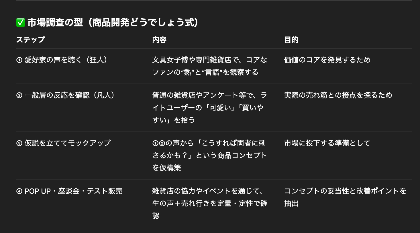個人的にですが、市場調査をするときって森岡毅さん的なロジックでいうとめちゃくちゃそれが好きな人と、一般の人の両方のニーズとウォンツを把握していくという感じで行います。