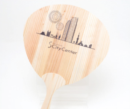 夏の展示会等で配布するノベルティとしておすすめの、国産スギ間伐材を活用した木のうちわ(取手付)です。薄くスライスした木の板を3枚貼りあわせているので割れにくく、夏の節電&エコ対策商品としてとても好評です。また印刷可能面積も広く、オリジナリティの高い販促品を製作いただけます。