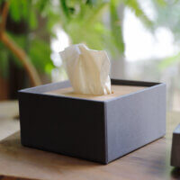 貼箱に木の上蓋でスタイリッシュなデザインに仕上げたティッシュケースです。インテリア雑貨としてはもちろん、空間のデザイン性が重要なホテルや旅館、サロン、スパなど、インテリアに気を配る施設に、空間のデザイン性を落とさずに設置することができます。