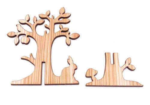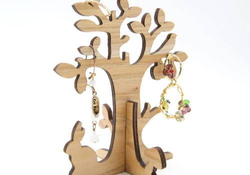 切り抜かれた二枚の板を組み合わせると、自立するかわいいオブジェになります。枝やうさぎの耳の部分に、ピアス、ネックレス、リングをディスプレイできます。