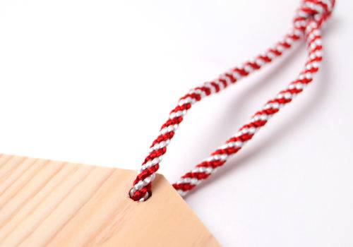 紐の色はデザインに合わせて複数からお選びください。かわいいミニサイズの「ミニ絵馬ストラップ」も人気です。