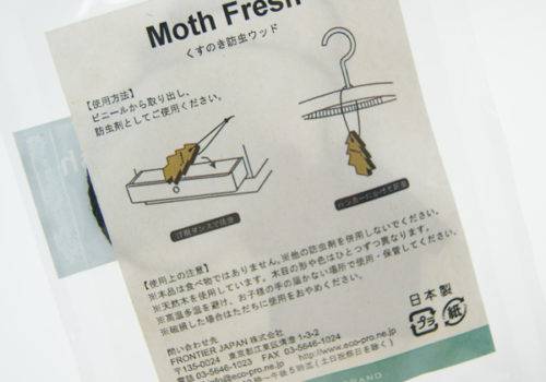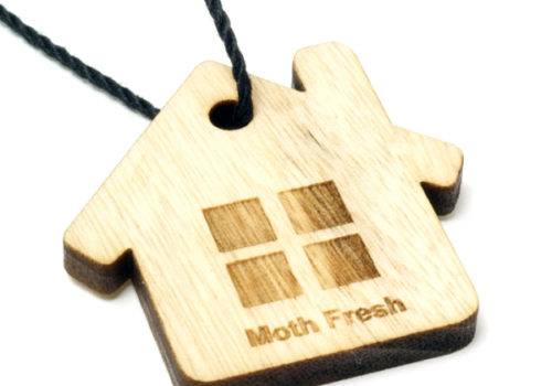 クスノキの防虫効果と消臭効果が詰まった木製モスフレッシュのノベルティです。ハンガーに吊るしてご活用ください。
