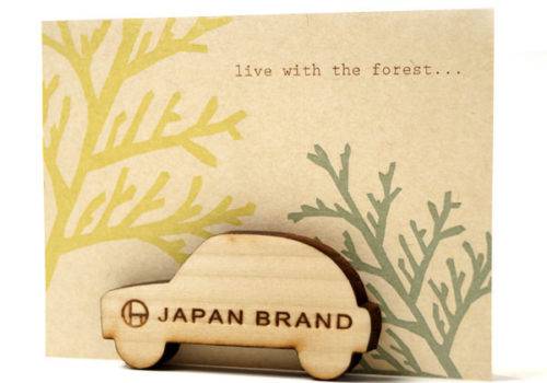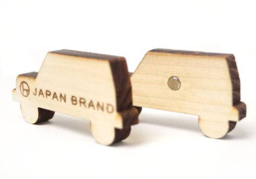 国産の杉間伐材でつくるマグネットカードスタンドです。ひとつでマグネットとして、またはふたつ合わせてカードスタンドとして使うことができます。レーザーカットでオリジナルの形状にカスタマイズが可能です。またオリジナルのでザインでパッケージ(取説台紙)も製作できます。