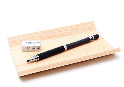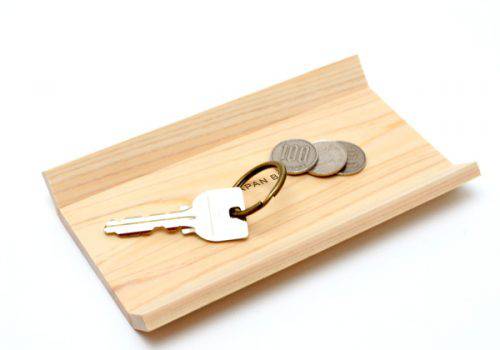 国産のヒノキ間伐材を使用し、板を折り曲げて作りました。立ち上がりがなだらかになっているため、鍵やメガネ、お釣りなども取りやすくなっています。名入れはトレイ部分に焼印・シルク印刷・レーザー彫刻が可能です。